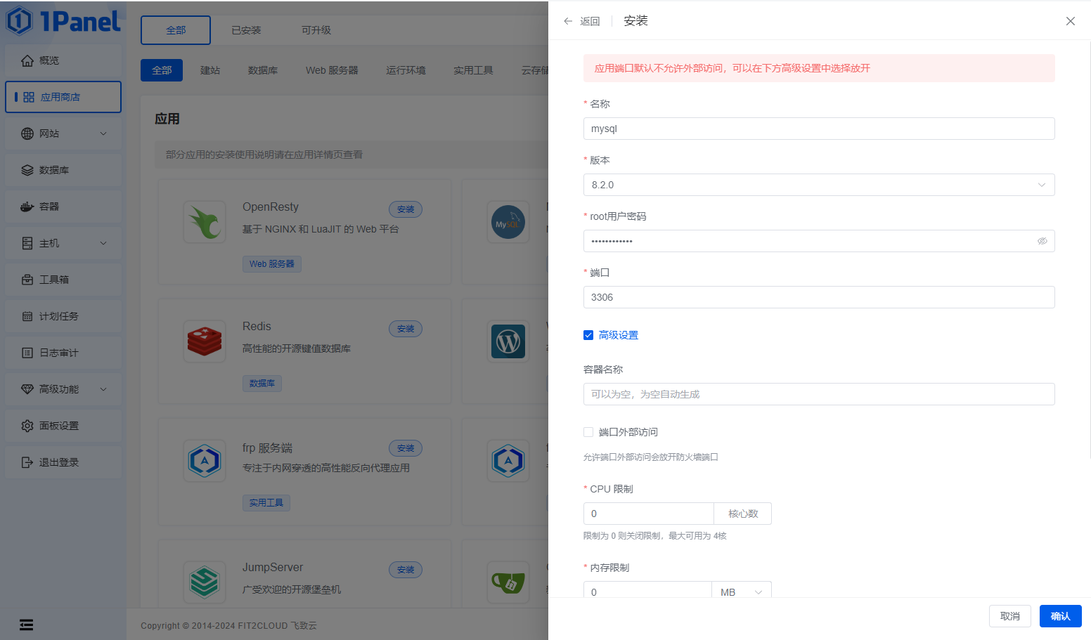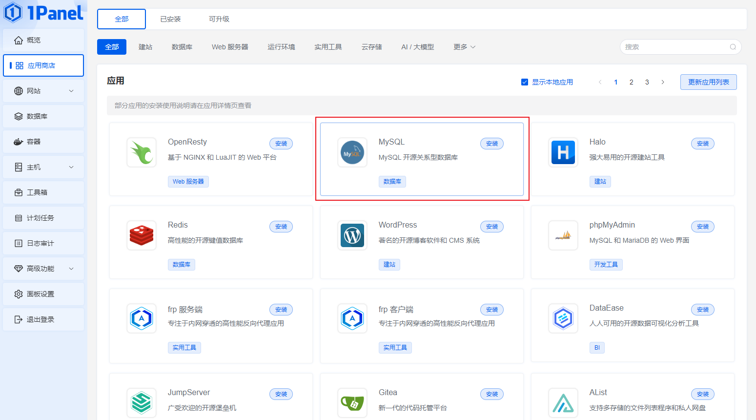在1Panel面板中进入应用商店,找到MySQL,点击安装。