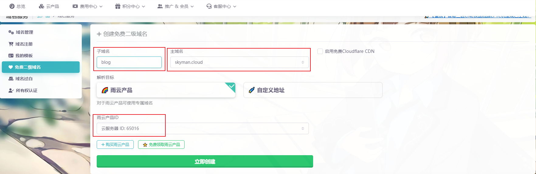 打开免费二级域名页面,子域名自己输入一个喜欢的,选择好主域名,点击立即创建。