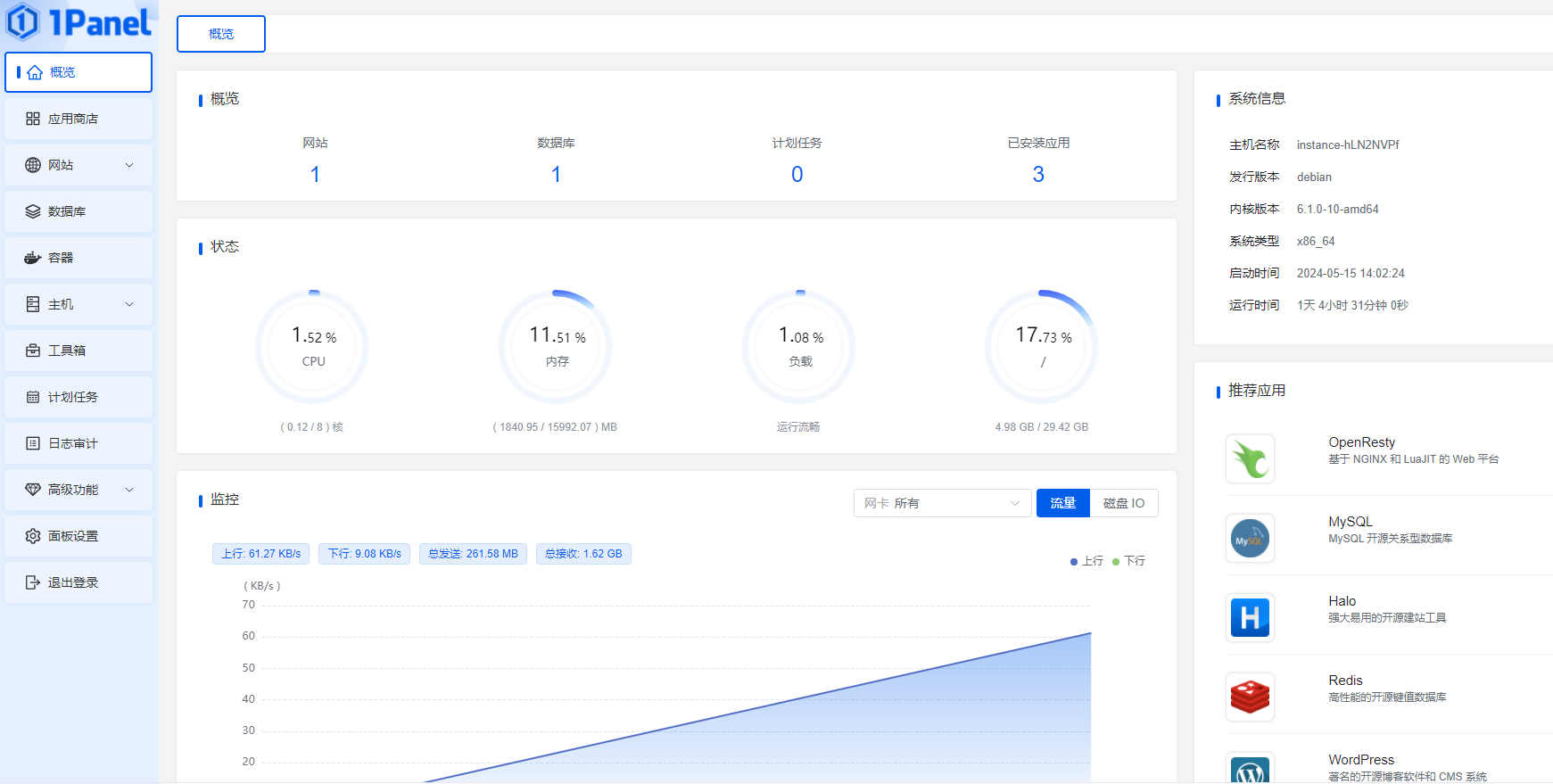 curl -sSL https://resource.fit2cloud.com/1panel/package/quick_start.sh -o quick_start.sh && bash quick_start.sh这个命令会自动下载脚本进行安装,过一会就会需要你确认安装参数,直接一路回车下去,全用默认随机生成的就行,安装完成会给你管理面板的访问地址、用户名和密码。