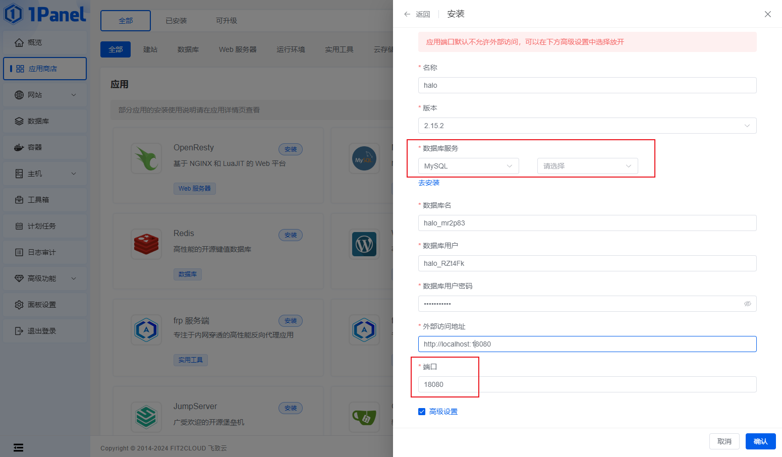 在弹出的页面中需要选择之前安装好的MySQL数据库服务,数据库的库名、用户名、密码不用更改,保持默认即可,为了能从外网访问到Halo服务,这里需要勾选端口外部访问 ,记录下端口号,然后点击确认进行安装。