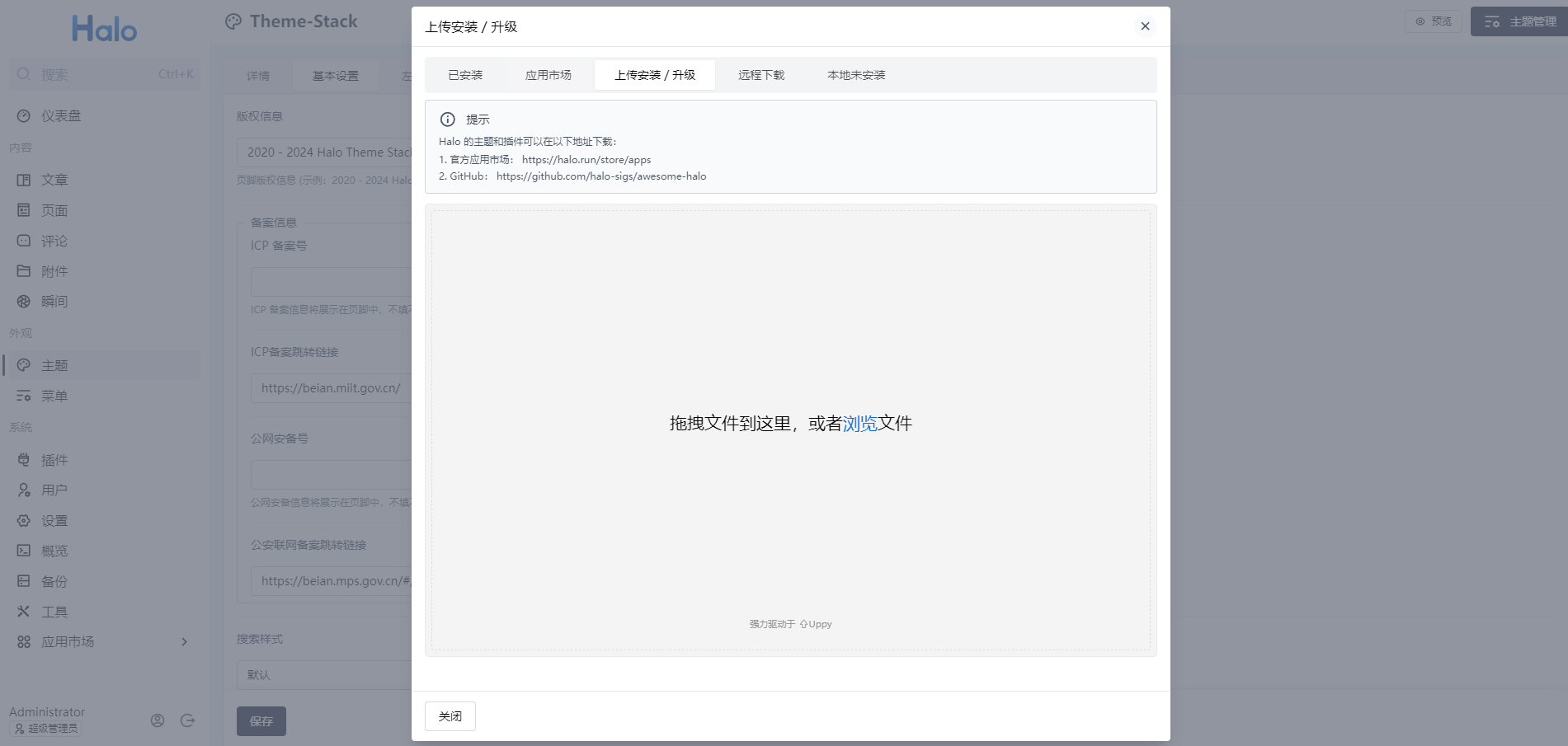 在网站后台页面右上角找到主题管理功能并进入,将下载下来的主题上传到后台。