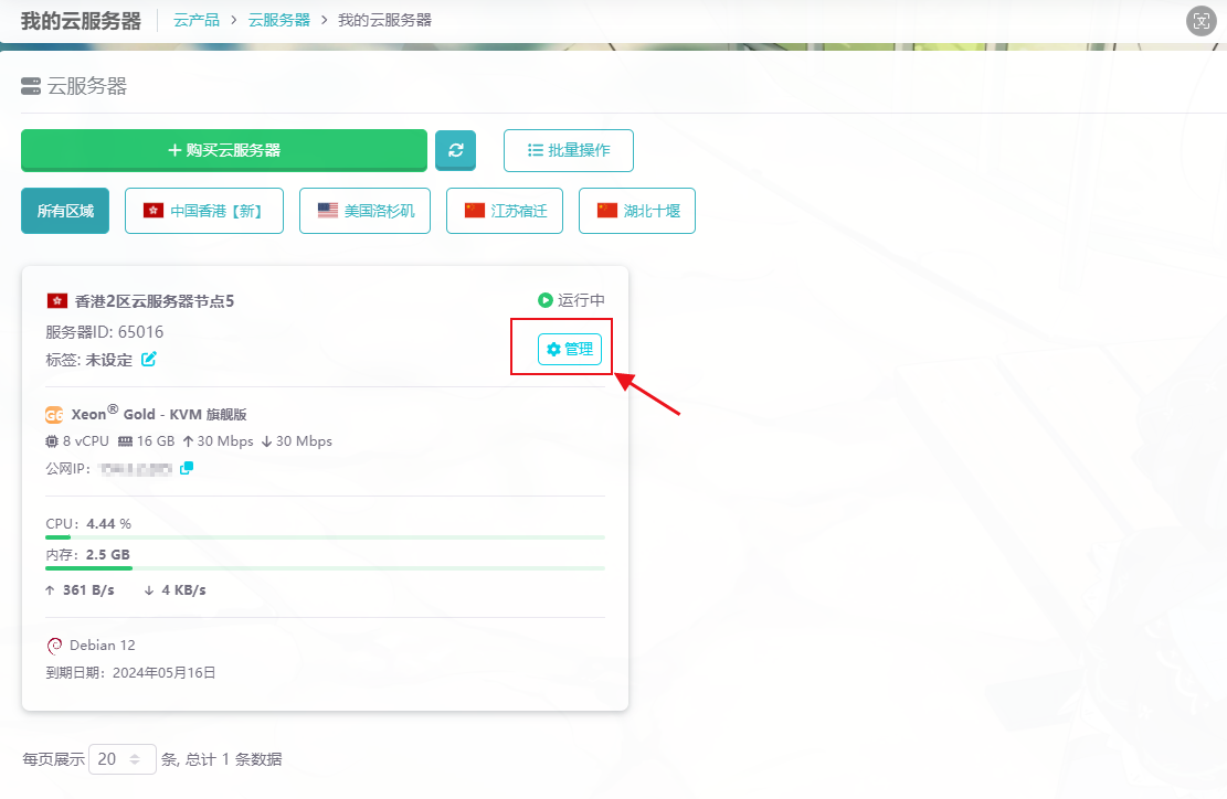 购买后即可在我的云服务器这里看到你买的云服务器,点击管理。