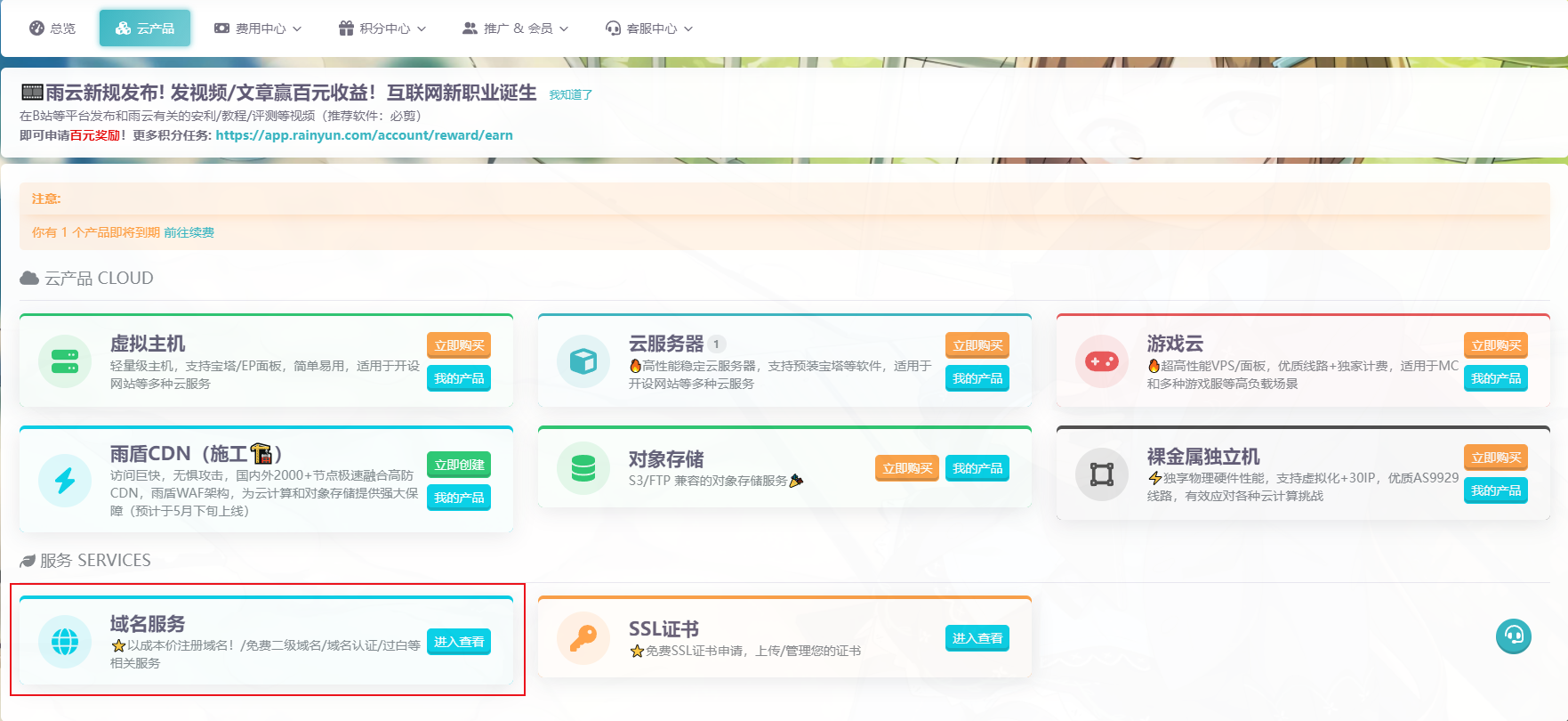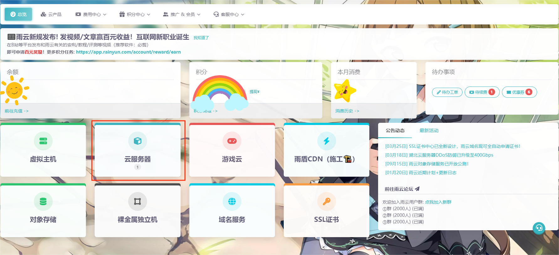 注册好账号之后进到雨云控制台,云服务器入口可以在后台的 总览 和 云产品 部分找到: