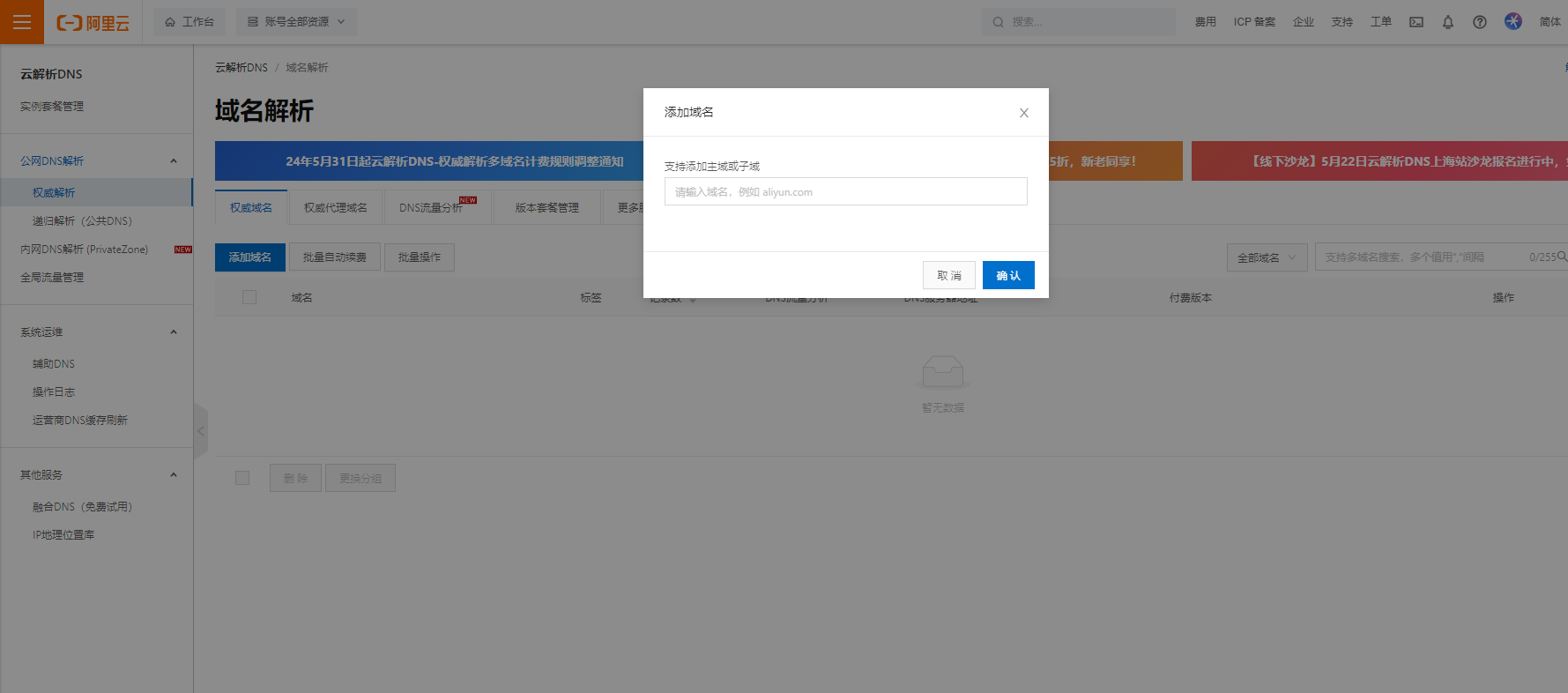 在域名解析页面,权威域名 页签下,单击 添加域名 按钮,在弹窗中输入主域名,并单击 确认 。