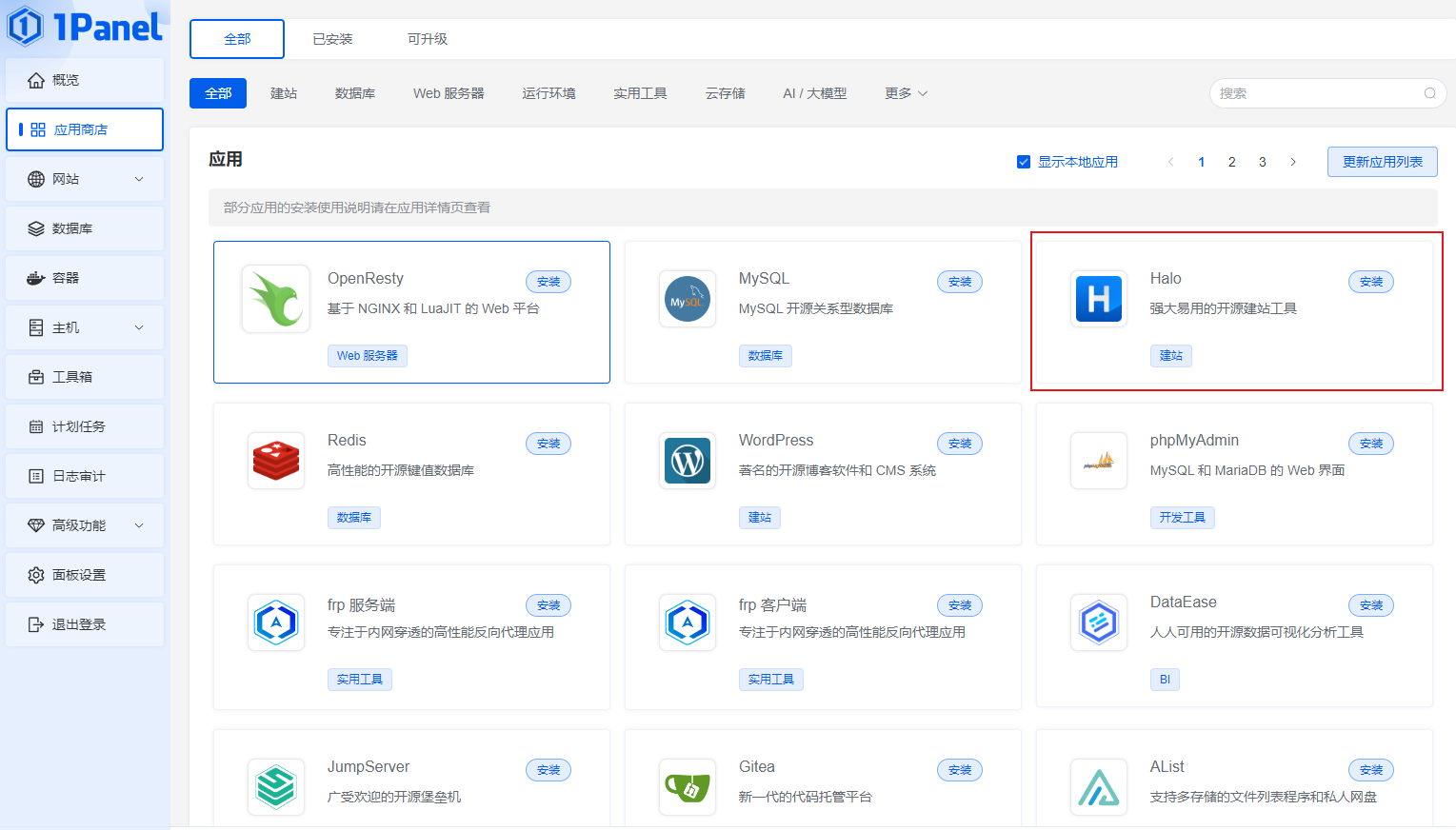 在1Panel面板中进入应用商店,找到Halo工具,点击安装。