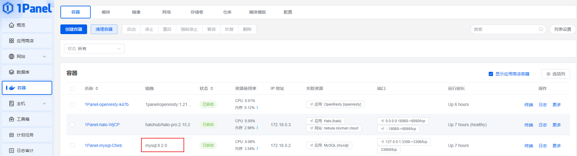 安装好后,在1Panel面板中进入容器,可以看到已安装好的MySQL容器。