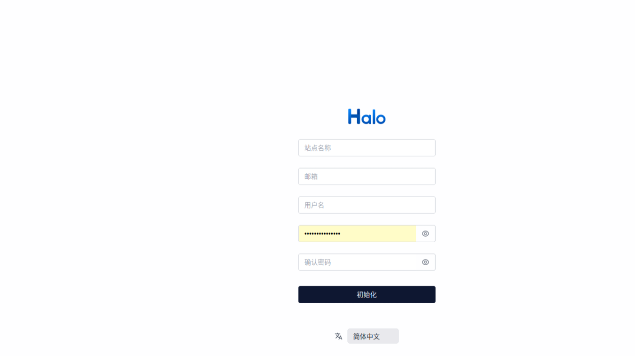 使用IP+端口号访问Halo服务,输入博客名称,邮箱、用户名、密码等信息,点击初始化,等待博客网站完成初始化。