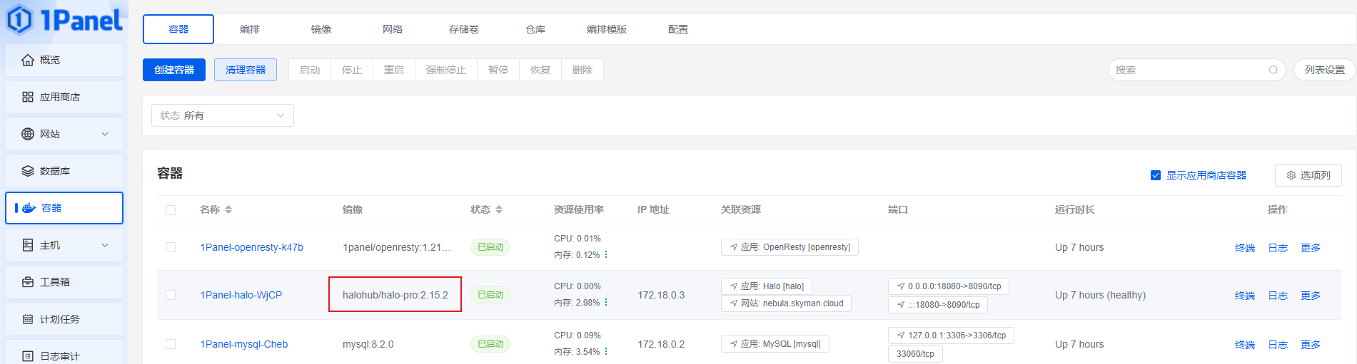 安装好后,在1Panel面板中进入容器,可以看到已安装好的Halo容器。