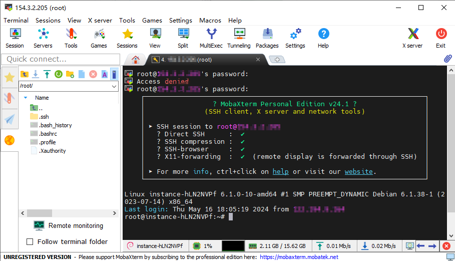 下载安装并打开ssh客户端软件,我这里用的是mobaxterm,在SSH客户端中输入你的服务器的IP地址、用户名(雨云控制台获取),还有SSH端口(一般默认是22),然后点击OK打开。