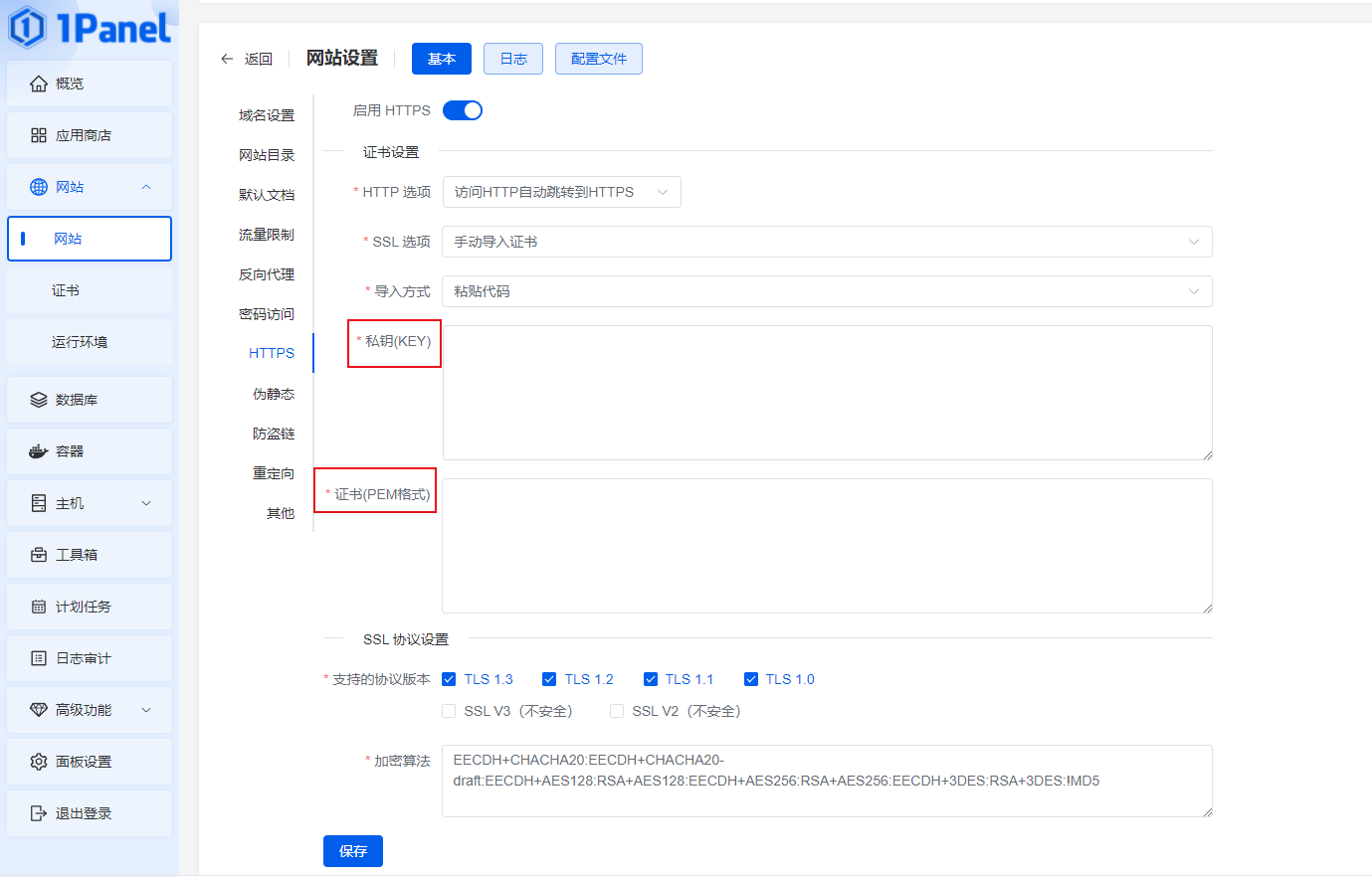 SSL选项选择 手动导入证书,将你申请好的证书和私钥填入,点击保存,即可启用HTTPS。