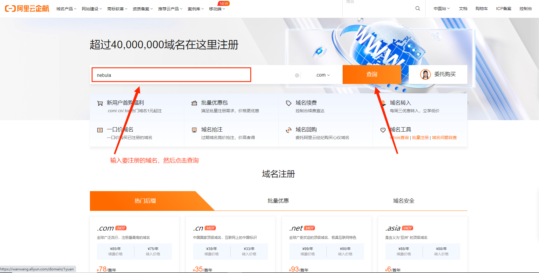 可以到腾讯云或阿里云等平台注册域名,当然你也可以使用雨云的免费二级域名。