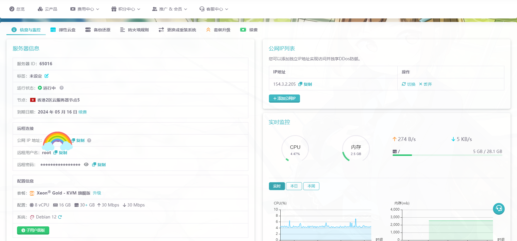 接着就可以看到云服务器的信息了,在这里扩容、端口映射、重装/切换系统等。等待服务器创建完成以及预安装APP安装完成。