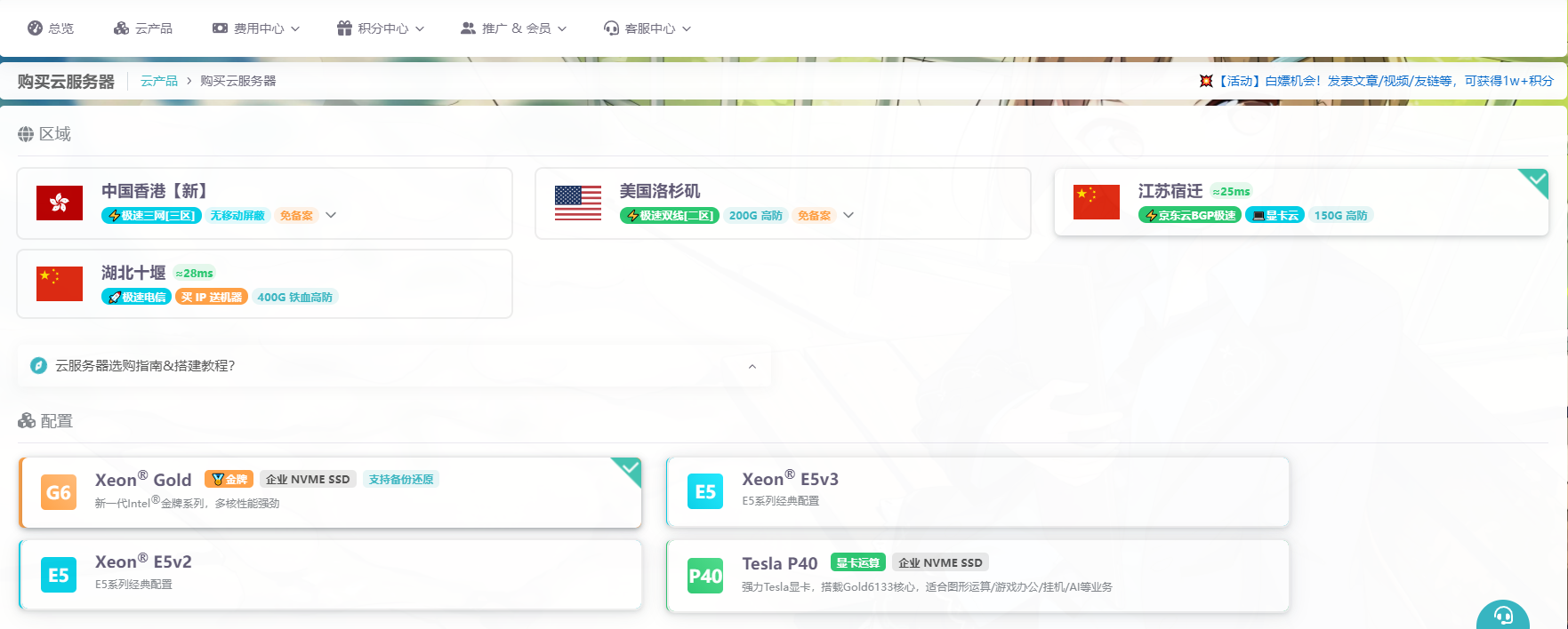 点击购买云服务器,选择服务器区域(国内用户建议选择内地机房,如果你没有备案域名那建议选择香港或美国的服务器)和配置(CPU性能:Xeon Gold > Xeon E5v3 > Xeon E5v2)。