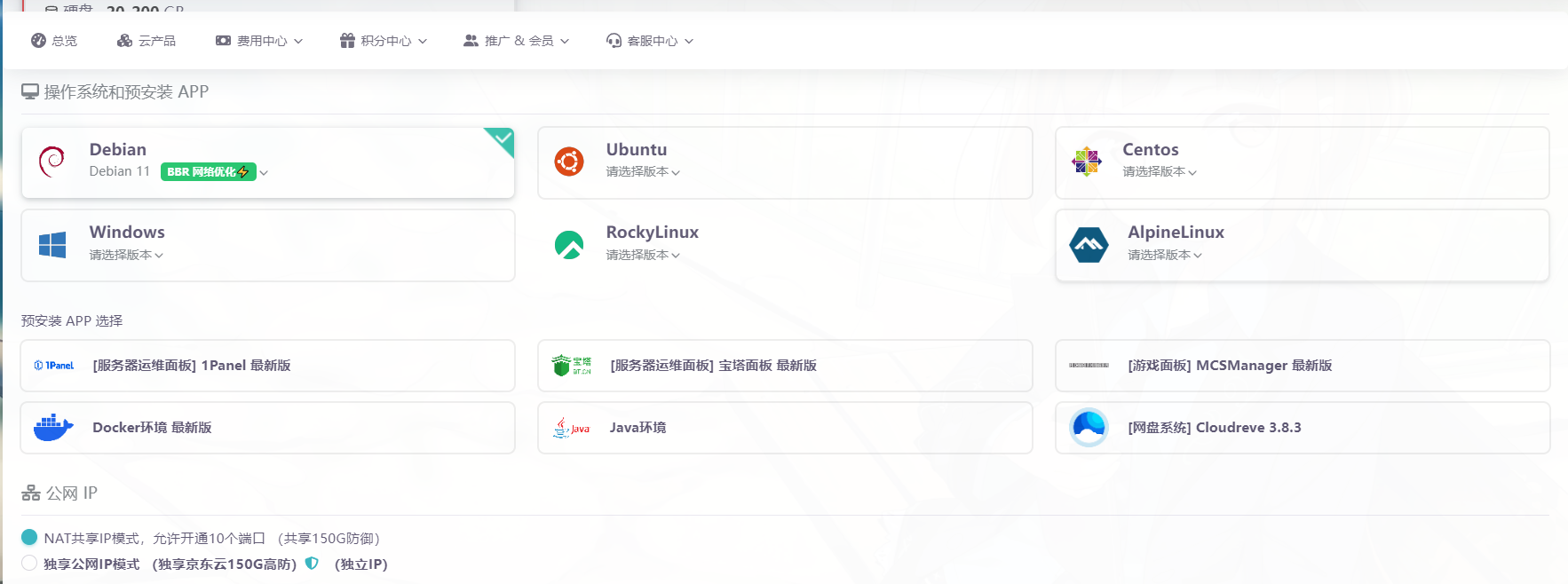 操作系统选择Debian12,预安装APP选择 [服务器运维面板] 1Panel 最新版,你也可以不选预安装APP,后面教程有教怎么安装1Panel ,选了预安装就会自动帮你装好,最后再选择IP。
